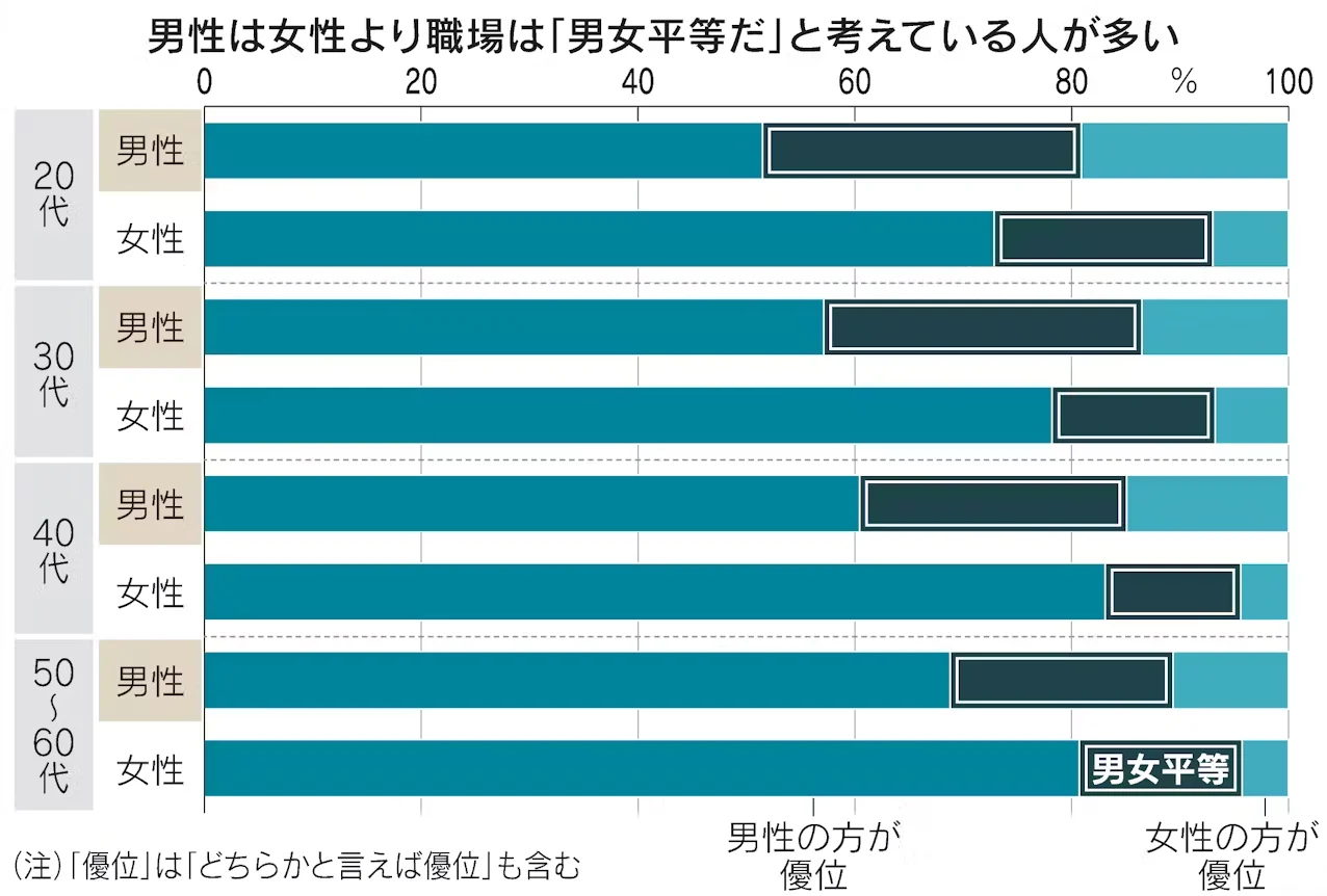 また、「職場において男性と女性のどちらが優位だと思うか」という調査では、女性が「女性が優位」と回答する割合は年代を問わず少ないことがわかりました。これに対して、男性は年代を問わず女性よりも「職場は男女平等だ」と考えている人が多かったのです。この認識の男女差は15〜20%もあります。