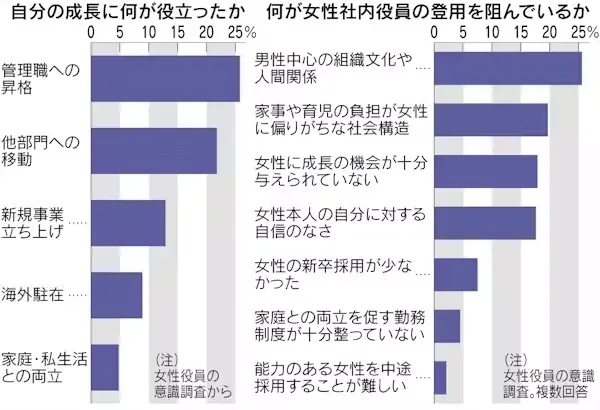 しかし、増加した女性役職者比率の内訳を見ると、弁護士や大学教授といった専門家がほとんどです。取締役のうち複数社兼務の取締役が占める割合でも、女性の割合は男性の約2.4倍にものぼります。女性の役職者が増えているとはいえ、社内で育てるといった理想形にはほど遠く、外部の専門家の力を借りているのが実情です。