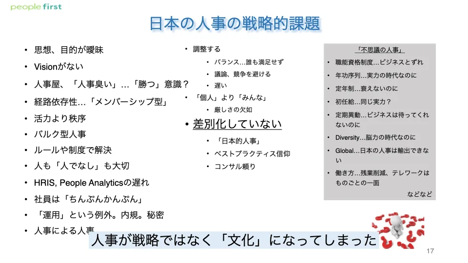 つまり、人事が戦略の武器になっていないという現実があります。どうやって人事を戦略化していけばいいのか? そこについてお話していきます。