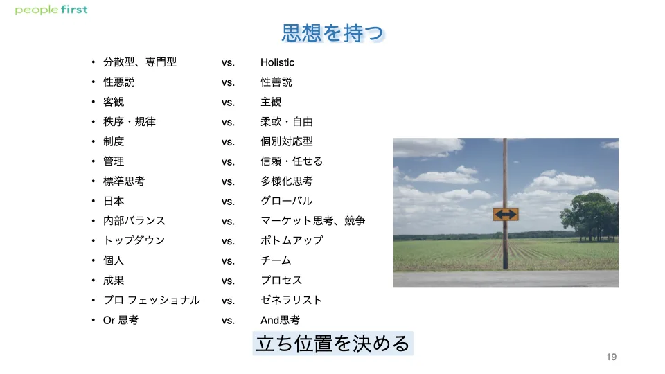 そのほか、性善説なのか性悪説なのか、秩序なのか柔軟なのか、管理なのか信頼なのか。これらについてどのようなバランスをつくっていくのか、自社なりの立ち位置を決めていくということです。そうしないと、異なる背景をもつ他社の施策をそのまま取り入れてしまう、なんてことになりかねない。なので、しっかりとした人事思想をもつことが大切なのです。