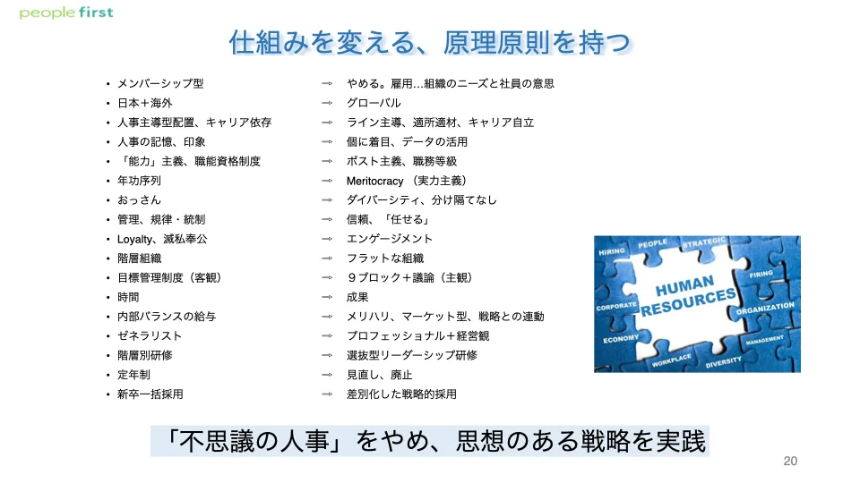 繰り返しますが、人事というのは差別化の源泉です。企業には歴史や思想があり、環境もそれぞれ異なる。同じことをやっているのはおかしいのです。