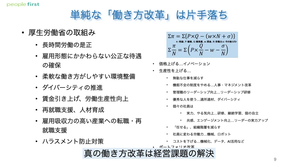 ビジネス全体のなかで一番利益を出せる体制のために、適切な人材配置、管理職のリーダーシップ向上、ダイバーシティ、権限移譲、AIやITの活用などの視点で、ポートフォリオを変革していく必要があるのです。そして、おかしなことや無駄なことをやめてエンゲージメントを高めて生産性を上げることが、働き方改革の本質であるはずです。