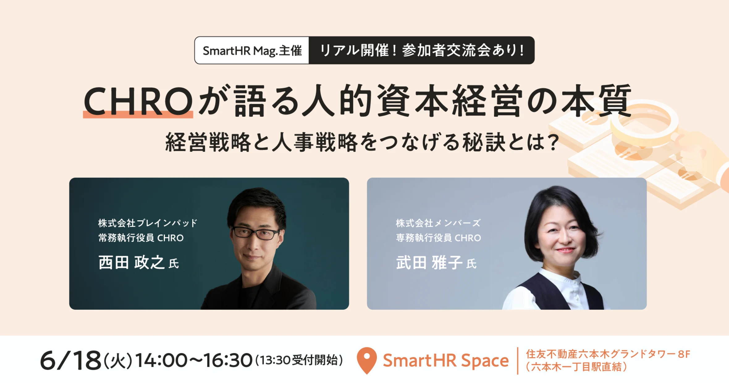 人的資本経営推進のヒントについて、CHROのお二方にお話しいただくSmartHR Mag.主催イベント「CHROが語る人的資本経営の本質〜経営戦略と人事戦略をつなげる秘訣とは?〜」を2024年6月18日(火)に開催します。
