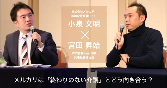 協賛講演として、株式会社SmartHRの代表・宮田昇始がモデレーターとなり、「成長企業は『事業拡大』と『働き方改革』をいかに両立させているのか?」をテーマに、フリマアプリ「メルカリ」を運営する株式会社メルカリの取締役社長兼COO 小泉文明氏にインタビューしました。