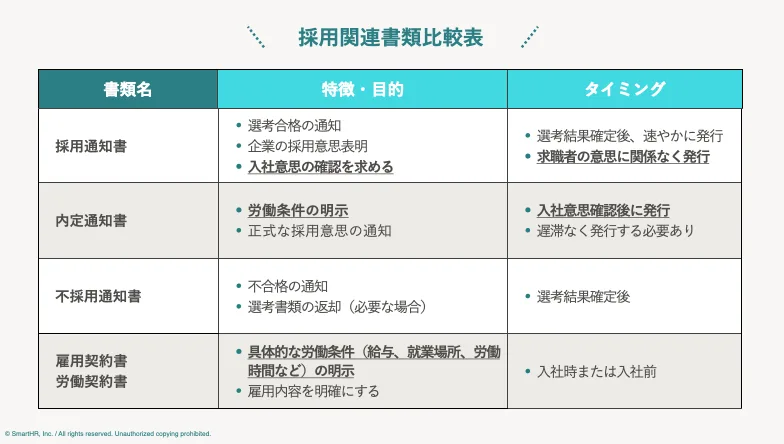 採用通知書は採用の意思決定を通知する書類であるのに対し、労働条件通知書は具体的な労働条件(給与、就業時間、休日など)を明示する書類という違いがあります。