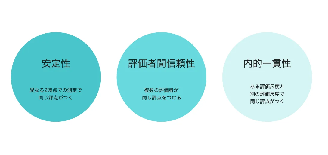 測定尺度の妥当性の主要な条件が、信頼性、すなわち精度の高さである。たとえば、ある評価要素(能力・行動・成果など)について、ある測定尺度を用いて異なる2時点で測定し、同じ評点がつく場合には、その尺度は「安定性」が高いといえる。ある貢献要素について、それに関する尺度を用いる2人の評価者が同じ評点をつける場合には、その尺度は「評価者間信頼性」が高いといえる。