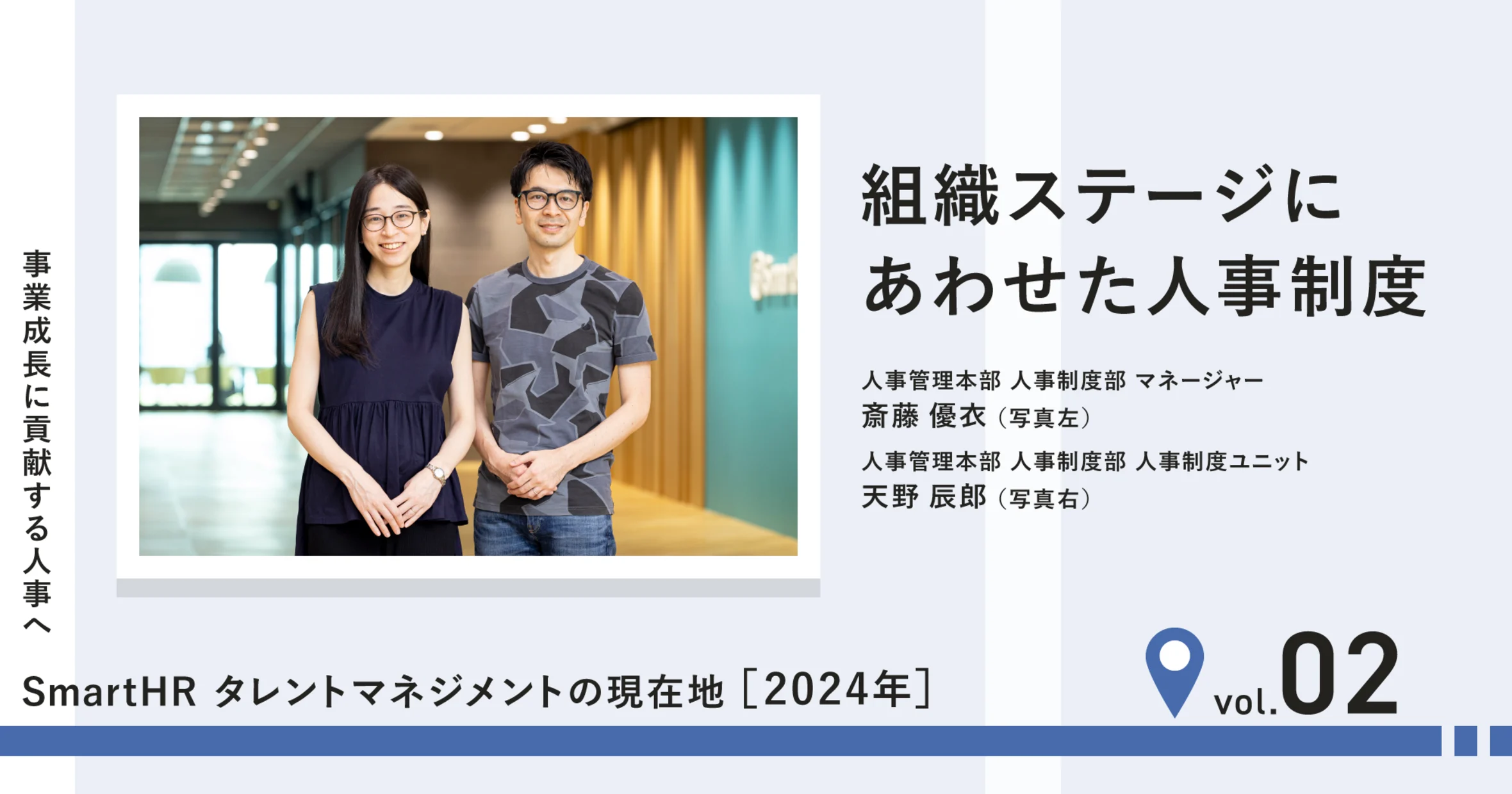 企業にとって、いつの時代も万能な人事制度はありません。事業や組織の成長にあわせて人事制度も変化が必要です。SmartHR社では2020年と2024年に人事制度を大きくリニューアルしました。それぞれどういった背景から検討を進めたのか。共通して重視している考えや、あえて“変えない”ポイントなど。人事制度改革に携わったSmartHR人事の斎藤さん、天野さんにお話を聞きます。
