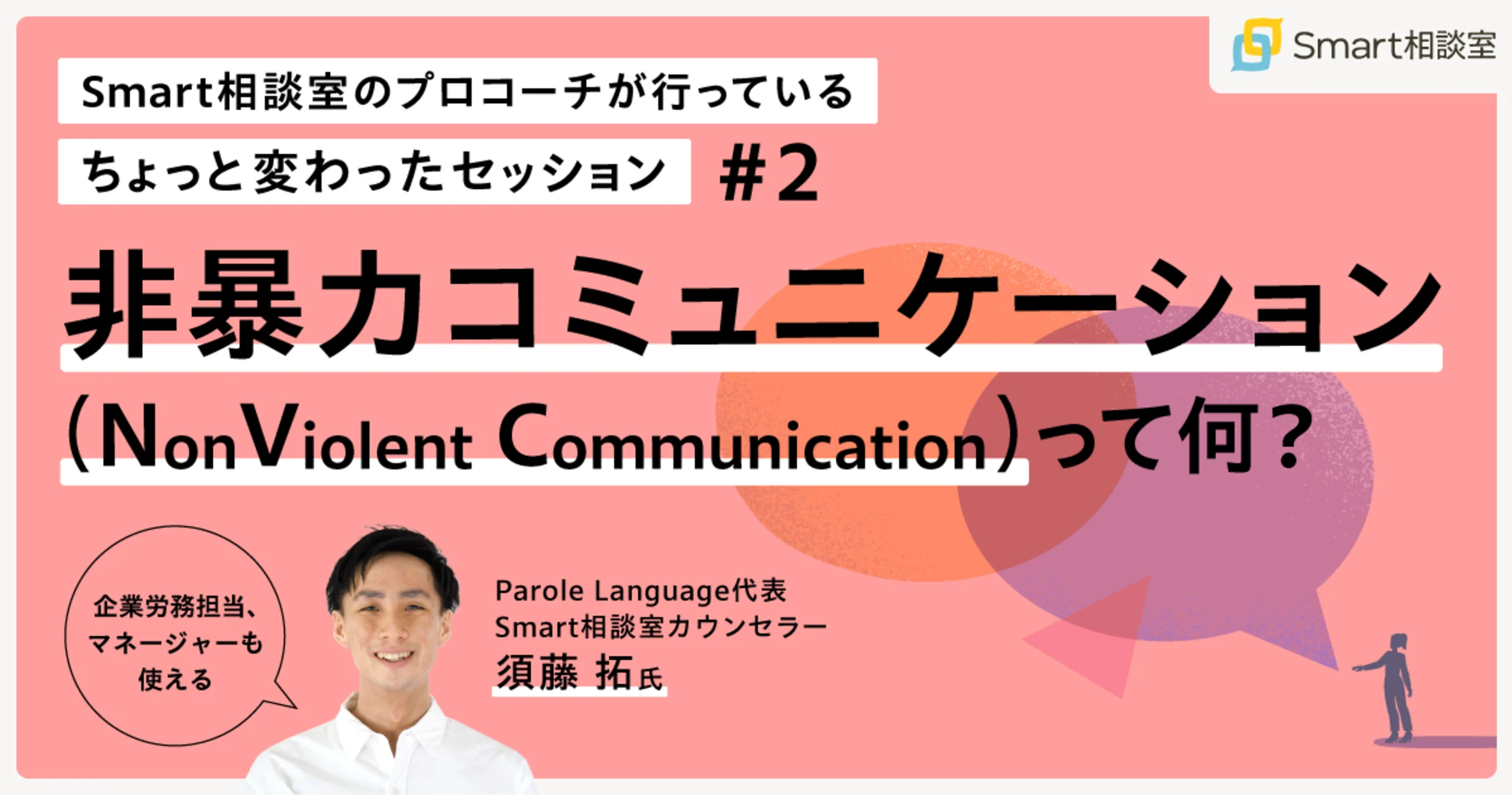 2023年1月24日、オンラインカウンセリングサービス「Smart相談室」を提供する株式会社Smart相談室主催のオンラインセミナー「Smart相談室のプロコーチが行っているちょっと変わったセッション#2 非暴力コミュニケーション(NVC)って何?」が開催されました。本稿では、Smart相談室カウンセラーの須藤 拓 氏をお迎えして、非暴力コミュニケーション(NVC)についてお話しいただいたセミナーの様子をお届けします。
