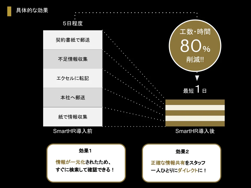 おかげさまで紙ベースのやり取りが激減。導入前には入退社のやり取りだけでも月5日ほどかかっていたものが、導入後には最短1日で完了できるようになりました。工数・時間を80%削減できたほか、情報の一元化によって検索や確認がしやすくなり、個々のスタッフとの情報のやり取りもリアルタイムで簡単にできるようになりました。