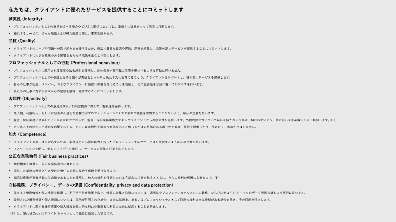 行動指針を見てみると、「品質」や「プロフェッショナルとしての行動」「能力」「公正な業務執行」が置かれ、コンサルタントの専門性を高めるための行動指針がしっかりと設定されていることが確認できます。