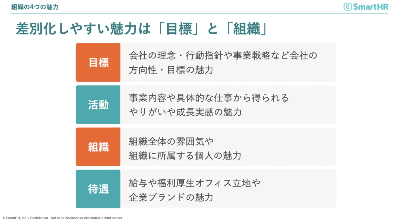 人が組織に求める魅力は「目標」「活動」「組織」「待遇」の4つといわれています。「目標」は、会社のミッションやビジョン、理念、事業戦略などの方向性です。「活動」の魅力は、会社の事業内容や具体的な仕事から得られるやりがいや成長。「組織」は、組織風土や組織の雰囲気にあたります。また、「〇〇社長がいるのでこの会社に入社しました」のように、組織に所属する個人の魅力も組織の魅力に該当します。4つ目の「待遇」は、報酬や会社のブランドです。
