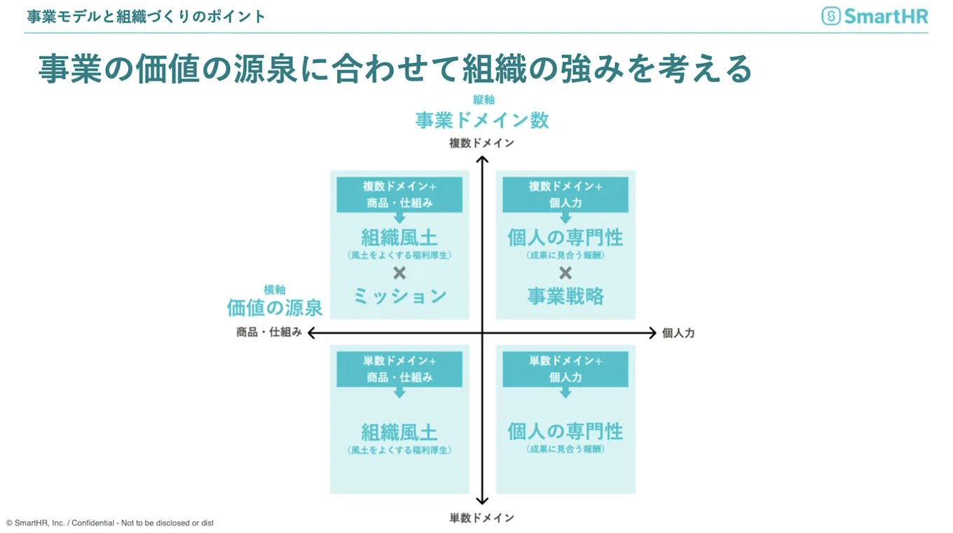 縦軸は事業ドメイン数です。事業が増えてくると、自社が何をしている会社なのかが社員に伝わりづらくなることがあります。このことに注意しながら会社のミッションや事業戦略で方向性を明確にした組織運営が重要になります。