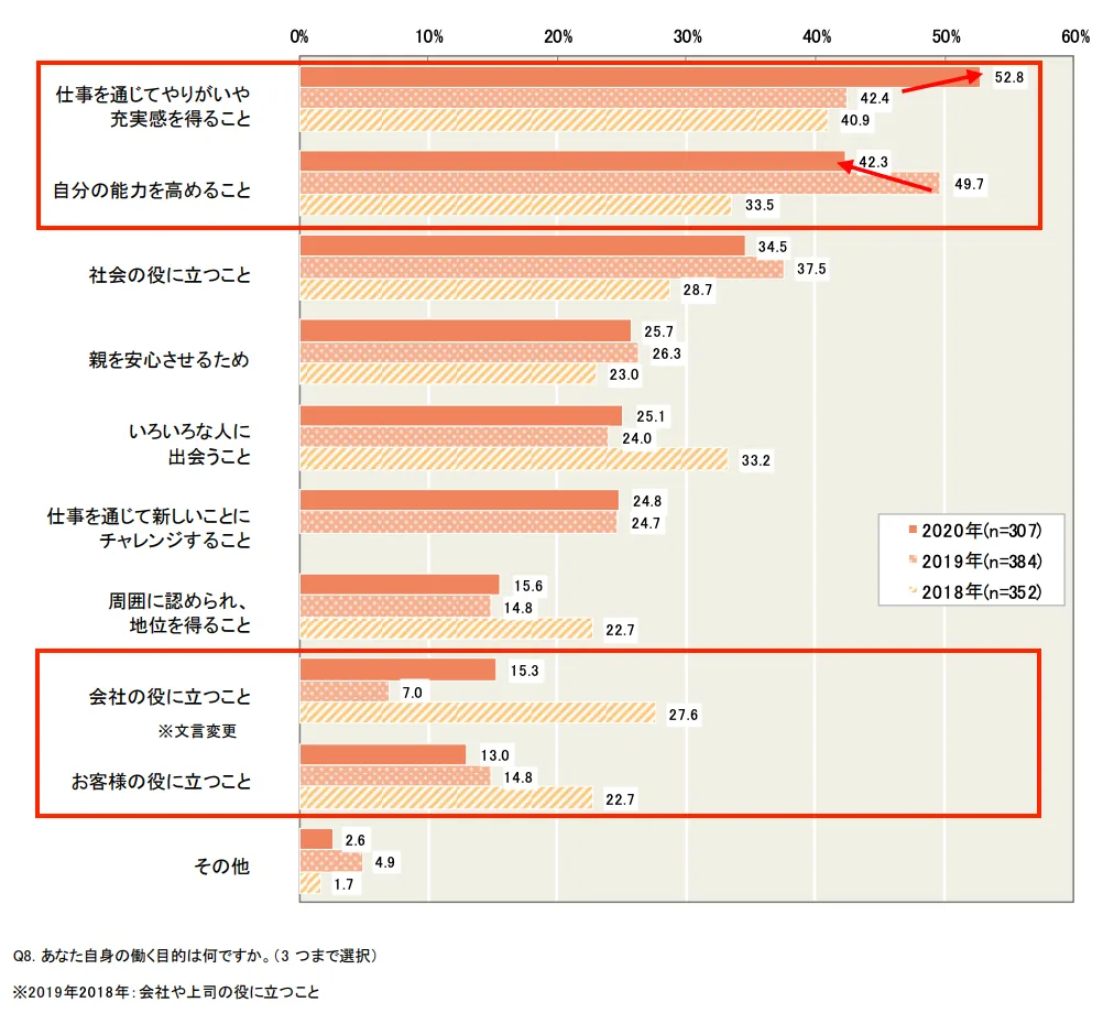 一方、「会社の役に立つこと」「お客様の役に立つこと」を目的とする新入社員は少なく、会社への帰属意識が低いことも確認できます。