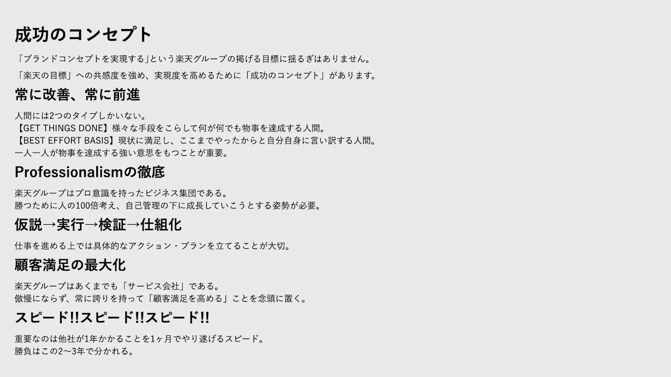 皆さんもご存知のとおり、Eコマースや通信、金融など、さまざまなサービスを展開する楽天グループは、私たちユーザーが各種サービスを使うことで会社としての価値を得ています。こうした事業モデルにおいては、「サービス」や「サービス提供の仕組み」の価値を高めるために、さまざまな事業部や部署が連携しながら、お客さまが感じたよかったところ、悪かったところをサービスや仕組みに還元し、改善していくことが重要です。