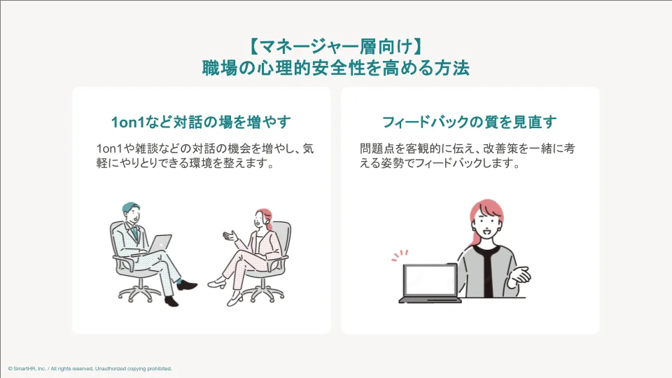 職場の心理的安全性を向上させるには、経営層・人事だけでなくマネージャー層の行動も欠かせません。マネージャー層ができる取り組みについてもご紹介します。