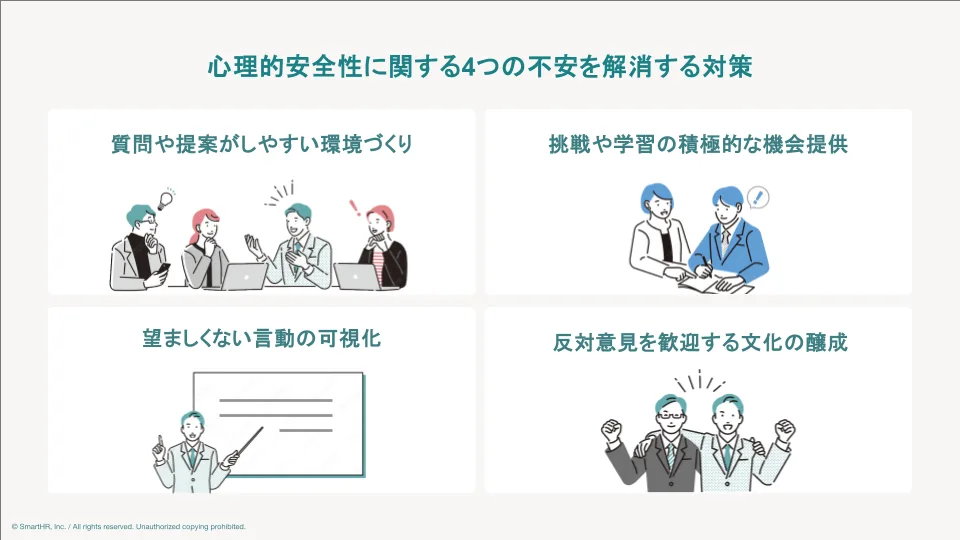 心理的安全性を阻害する要因には「無知だと思われる不安」「無能だと思われる不安」「邪魔していると思われる不安」「ネガティブだと思われる不安」の4つがあります。まずはこれらの不安を解消し、土台を整えましょう。