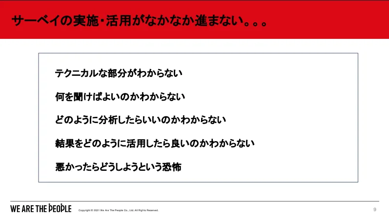 私が準備してきた項目は、まずテクニカルな部分が分からないこと。そしてどんな項目を聞き、どう分析し、結果をどう活用したら良いのか分からないというところです。また、「悪かったらどうしよう」という恐怖です。特に経営陣の方がお持ちでしょう。こういった障壁がある中での導入は、運用の成果をもって説得していただくのがよいと思います。