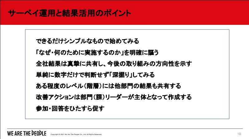 2点目は、何のために実施するのかを明確にすること。目的が人事制度の刷新ならは、従業員が感じる課題感や会社全体に抱いている想いを知るための設計が必要です。エンゲージメントをあげたいならば、エンゲージメントの度合いを測りたいからやるという文脈を明確にするべきです。
