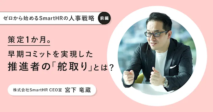 前編では、2023年11月にSmartHR社に入社し、CEO室(人事)として1か月で当社の人事戦略策定を成し遂げた宮下竜蔵さんに、策定から導入までを伺いました。