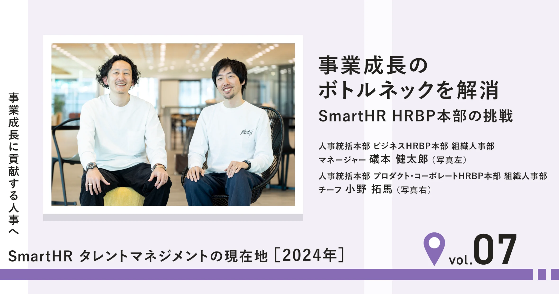 株式会社SmartHRは2024年7月に人事組織を再編し、新たにHRBP本部を組成しました。同社のHRBP本部は会社全体を俯瞰して課題を設定し、「共創パートナー」として現場のマネジメント層と課題を解決していくことをミッションとしています。人事部や現場部門とどのように関係を築き、課題解決に取り組んでいるか、HRBP本部のおふたりにお話を伺いました。