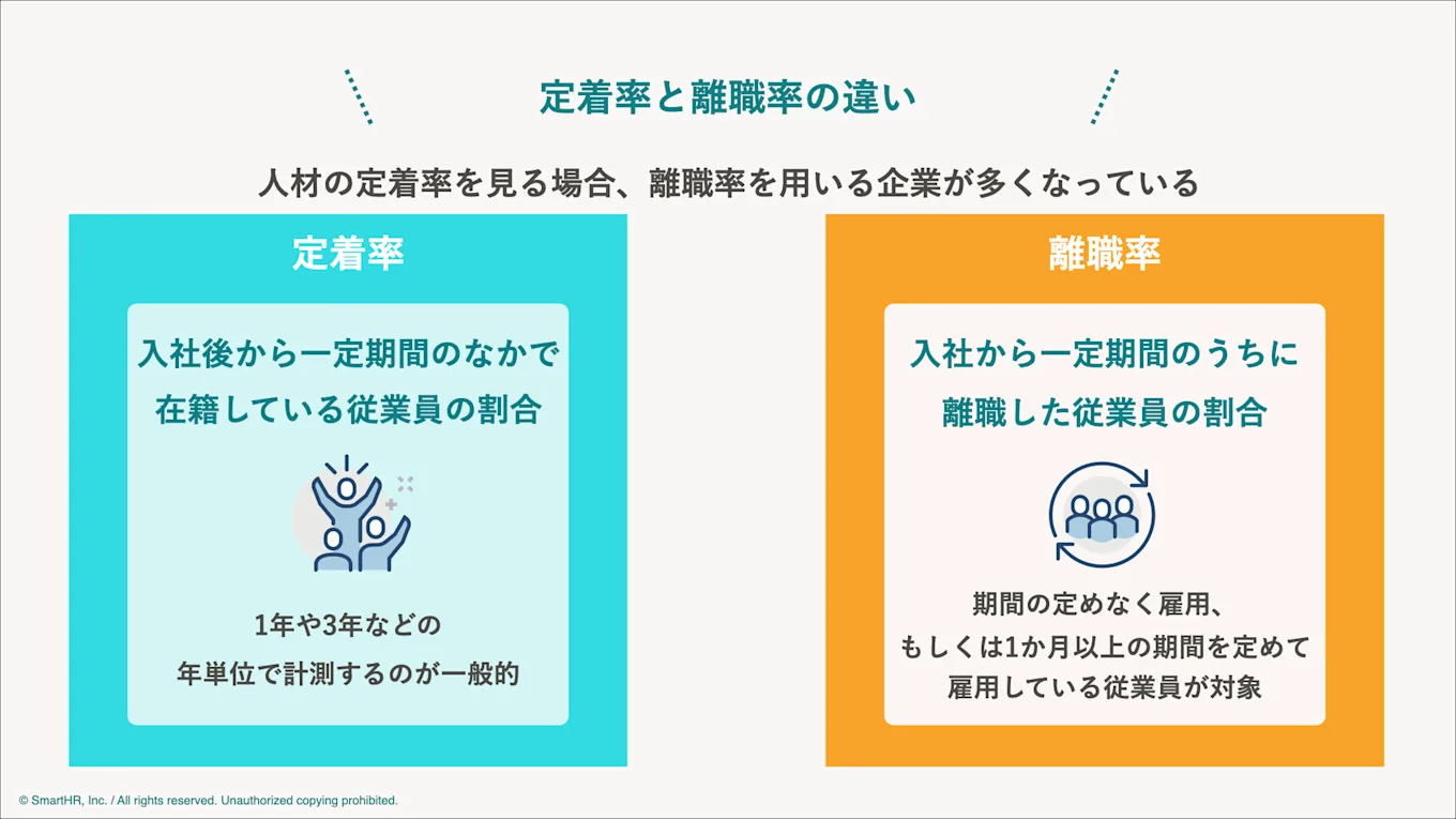 「離職率」は「定着率」の真逆の指標ともいえるため、一般的に人材の定着率を見る場合、離職率を用いる企業が多くなっています。