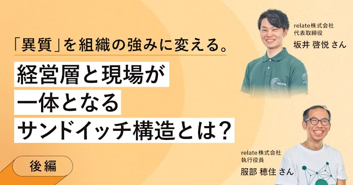 そこで、本記事ではエンゲージメントと強い相関関係にあるとされる自己効力感に着目しました。従業員の自己効力感を高めるための「個性と強みの開放」をテーマに、エンゲージメントの向上へつながる具体的な打ち手について、relate株式会社代表取締役の坂井啓悦さんと、執行役員の服部穂住さんにお話を伺いました。
