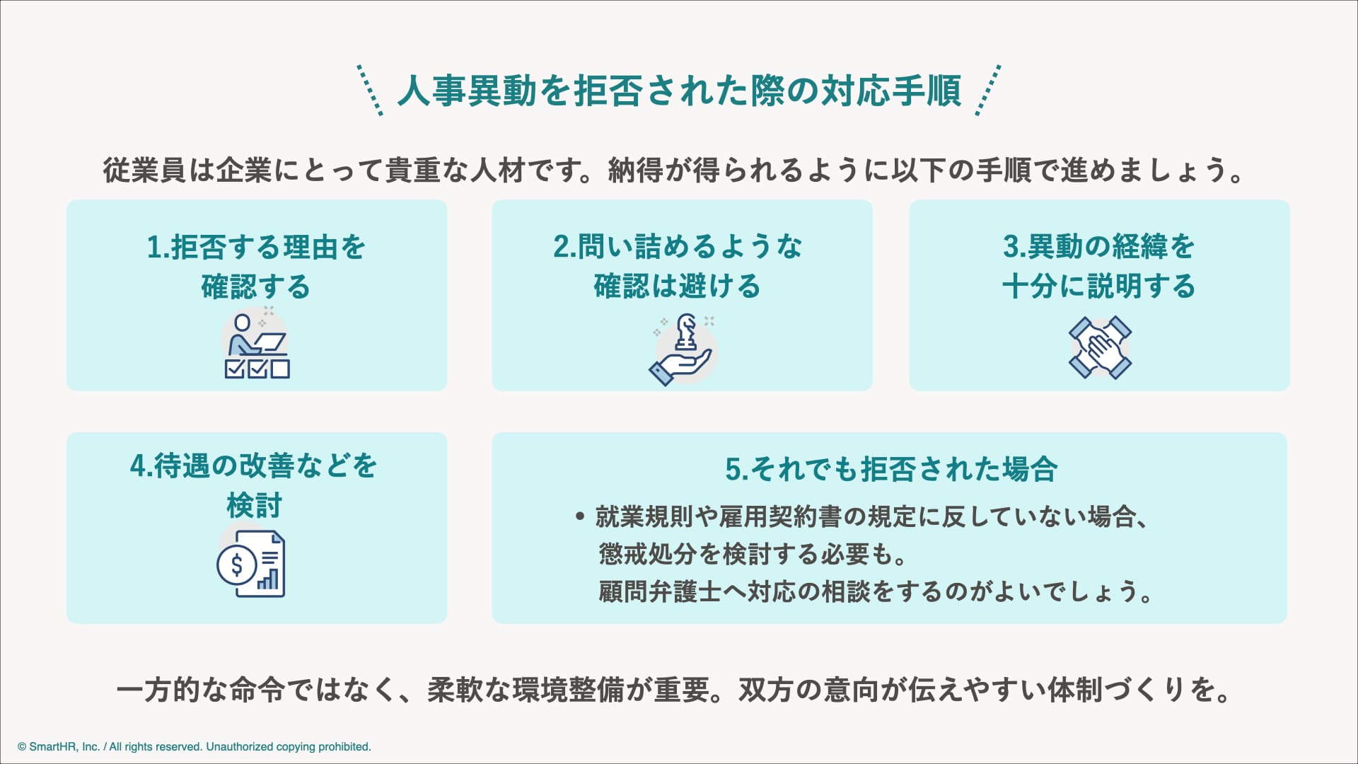 ただし、十分注意していても、従業員が異動を拒否する可能性はなくなりません。従業員に人事異動を拒否された場合の対応は、以下の記事を参考にしてください。