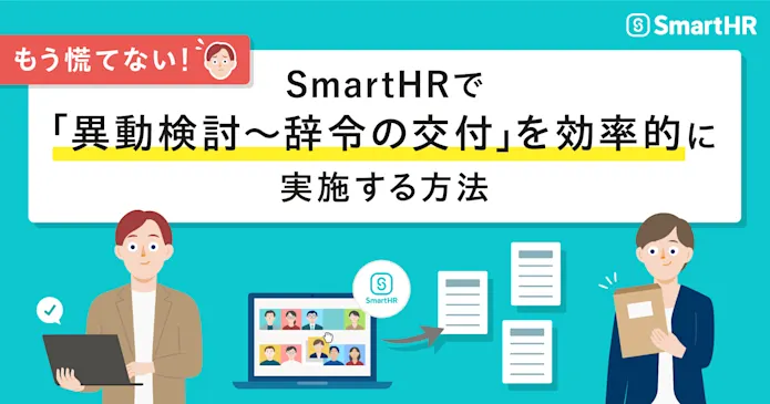 また、内示後の辞令交付業務も重要です。なかでも「辞令交付前後が慌ただしくなりがち」とお悩みの方に向けて、以下の記事ではSmartHRを活用し、異動検討から辞令交付まで業務効率化する方法をご紹介しています。ぜひ合わせてご覧ください。