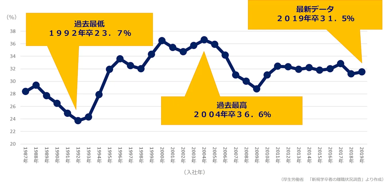 まずは、「大卒の新卒入社後3年以内の離職率」について、厚生労働省が発表した資料をご紹介します。