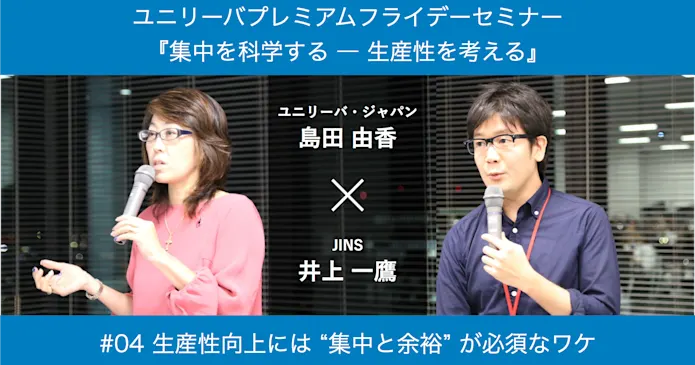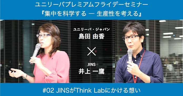 2018年1月26日、株式会社ジンズのセミナールームおよび同社の手がける「Think Lab」において、ユニリーバ・ジャパンが主催する「第10回ユニリーバプレミアムフライデーセミナー」が開催されました。テーマは『集中を科学する ― 生産性を考える』。ファシリテーターはユニリーバ・ジャパン・ホールディングス株式会社 取締役人事総務本部長の島田由香さん。そして、ゲストスピーカーは「集中力 パフォーマンスを300倍にする働き方」の著者である株式会社ジンズ・JINS MEMEグループマネジャーの井上一鷹さんです。