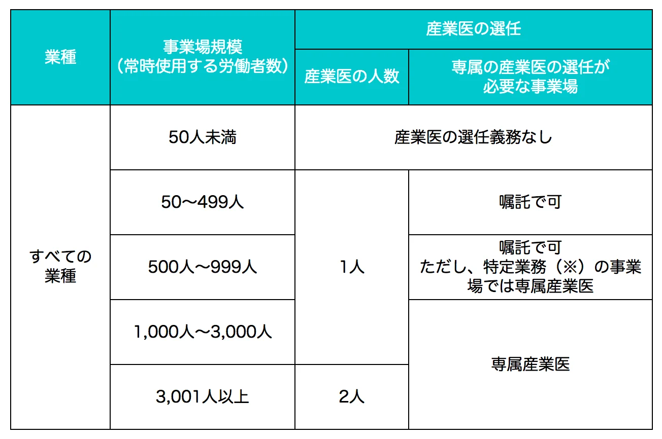 事業場単位でその労働者数規模により選任する産業医の人数と選任形態が下表のように決められています。