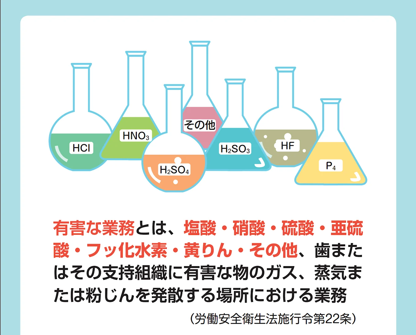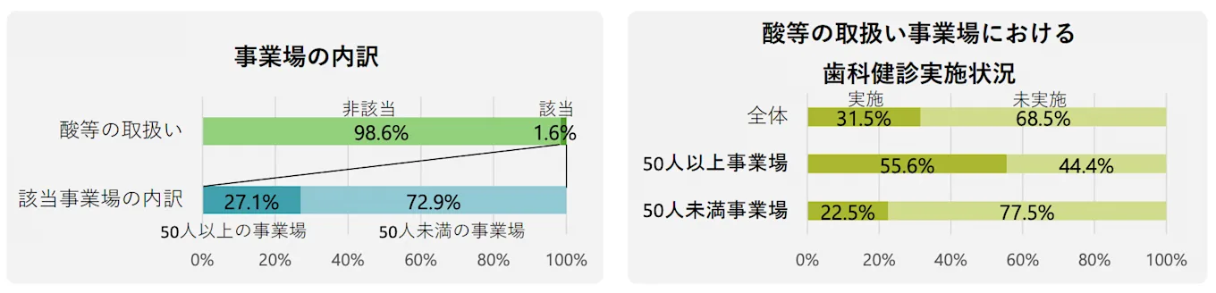 酸などの取り扱い業務は、化学工業、窯(よう)業・土石製品製造業、 非金属製品製造業に多く見られます。これらの業種の労務担当者は、まずは歯科医師による健康診断を適切なタイミングで実施しているかを確認しましょう。