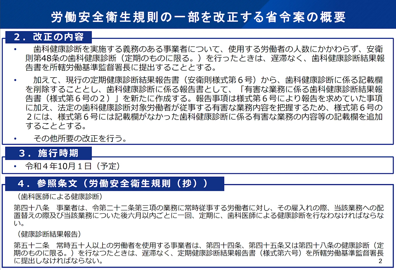 対象業務に常時従事する労働者への歯科健康診断そのものについては、事業規模にかかわらず、法令で事業者に実施が義務付けられていましたが、実施状況を労働基準監督署へ報告する義務は、常時50人以上の労働者を使用する事業者のみに課せられていました。