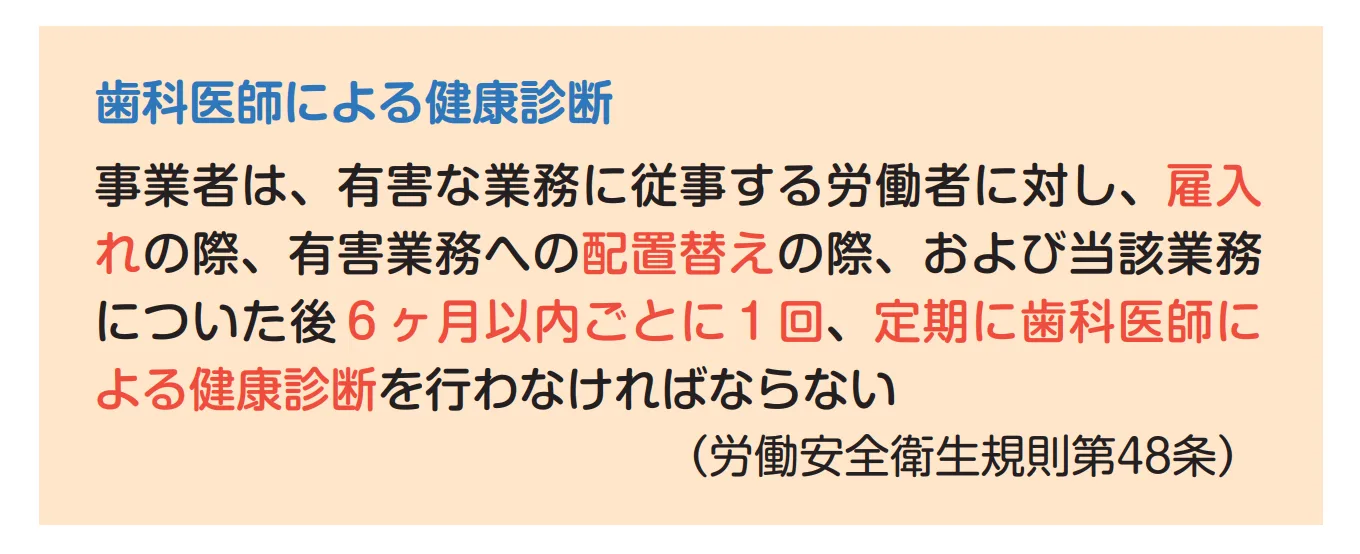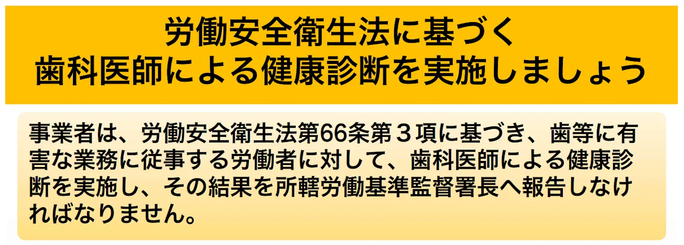 その一つが、歯などに有害な業務に従事する労働者に対して実施する「歯科医師による健康診断(労働安全衛生法第66条第3項)」です。