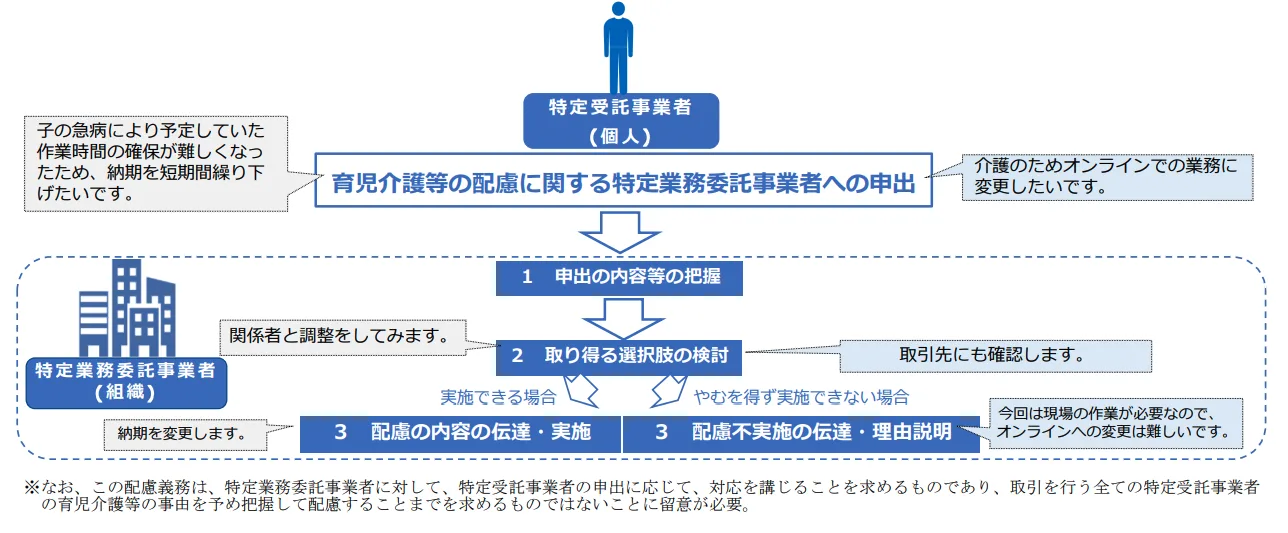 6か月以上の業務委託について、フリーランスが育児や介護などと業務を両立できるよう、フリーランスの申出に応じて必要な配慮をしなければならないこと。