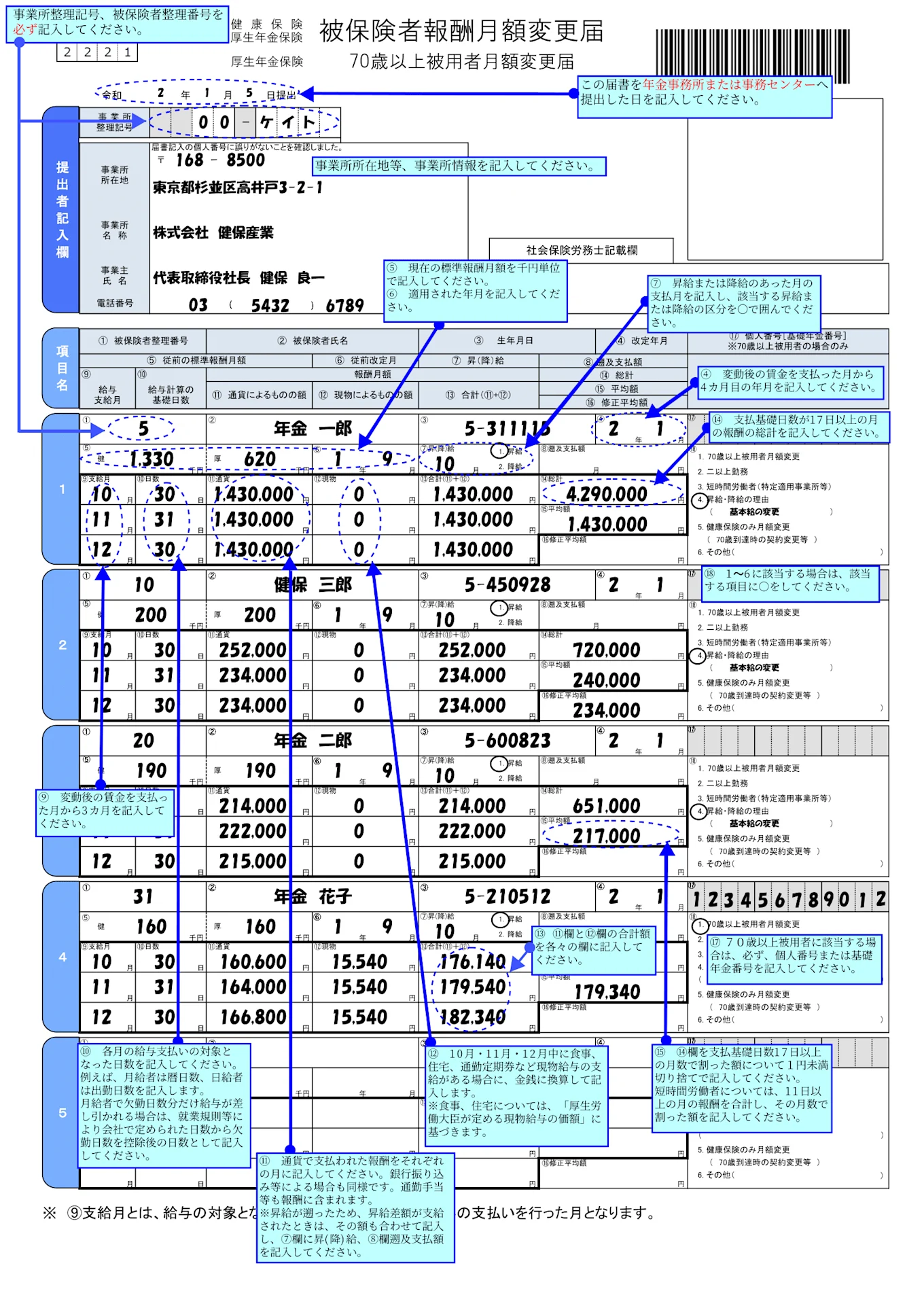 (出典)健康保険・厚生年金保険 被保険者報酬月額変更届/厚生年金保険 70歳以上被用者月額変更届(記入例) - 日本年金機構
