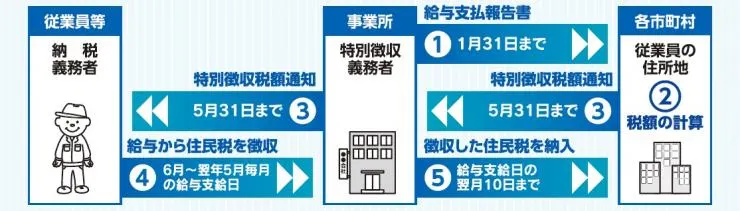 個人住民税の特別徴収とは、事業主(給与支払者)が、毎月従業員(納税義務者) に支払う給与から個人住民税を徴収(差し引き)し、従業員に代わって、従業員の住所地の区市町村へ納入する制度のことです。