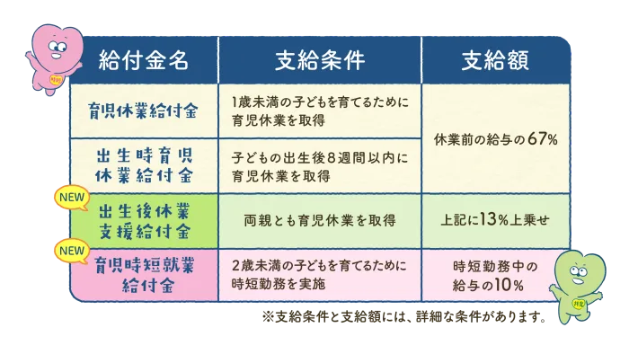 一方、育児休業等給付は、育児による休業や短時間勤務をした場合の収入を補填します。