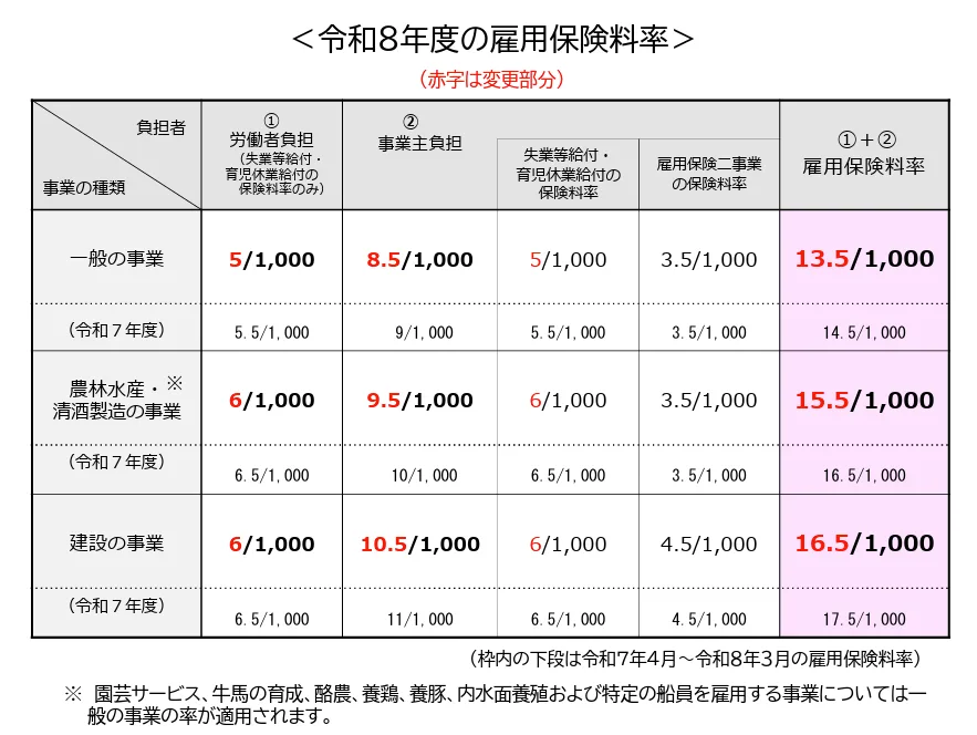 雇用保険料率は毎年4月に見直される場合があります。令和8年度の雇用保険料は次のとおりで、令和7年度と比較すると、労働者負担・事業主負担ともに1,000分の0.5(0.05%)ずつ引き下げとなりました。