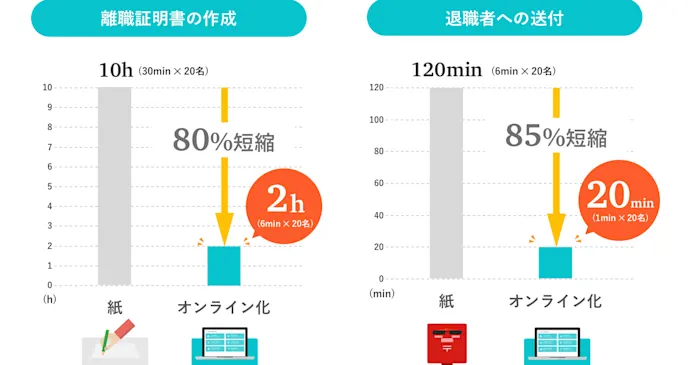 手続きを電子上で行うため、紙のやり取りや印刷作業も不要です。退職手続きで本人に書類を送付する場合、本人署名や押印も不要で、書類データを送信すれば完了できます。そのため、手続きに要する時間とコストの削減が可能です。