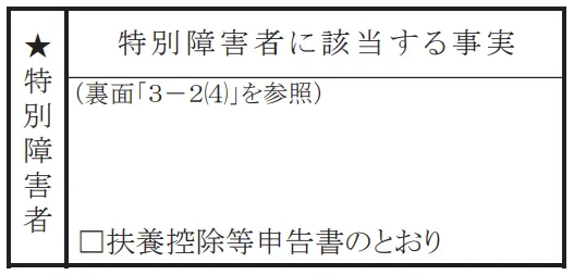 なお、特別障害者に該当する人が「扶養控除等申告書」に記載している特別障害者と同一である場合には、特別障害者に該当する事実の記載に代えて「扶養控除等申告書のとおり」と記載して差し支えありません。