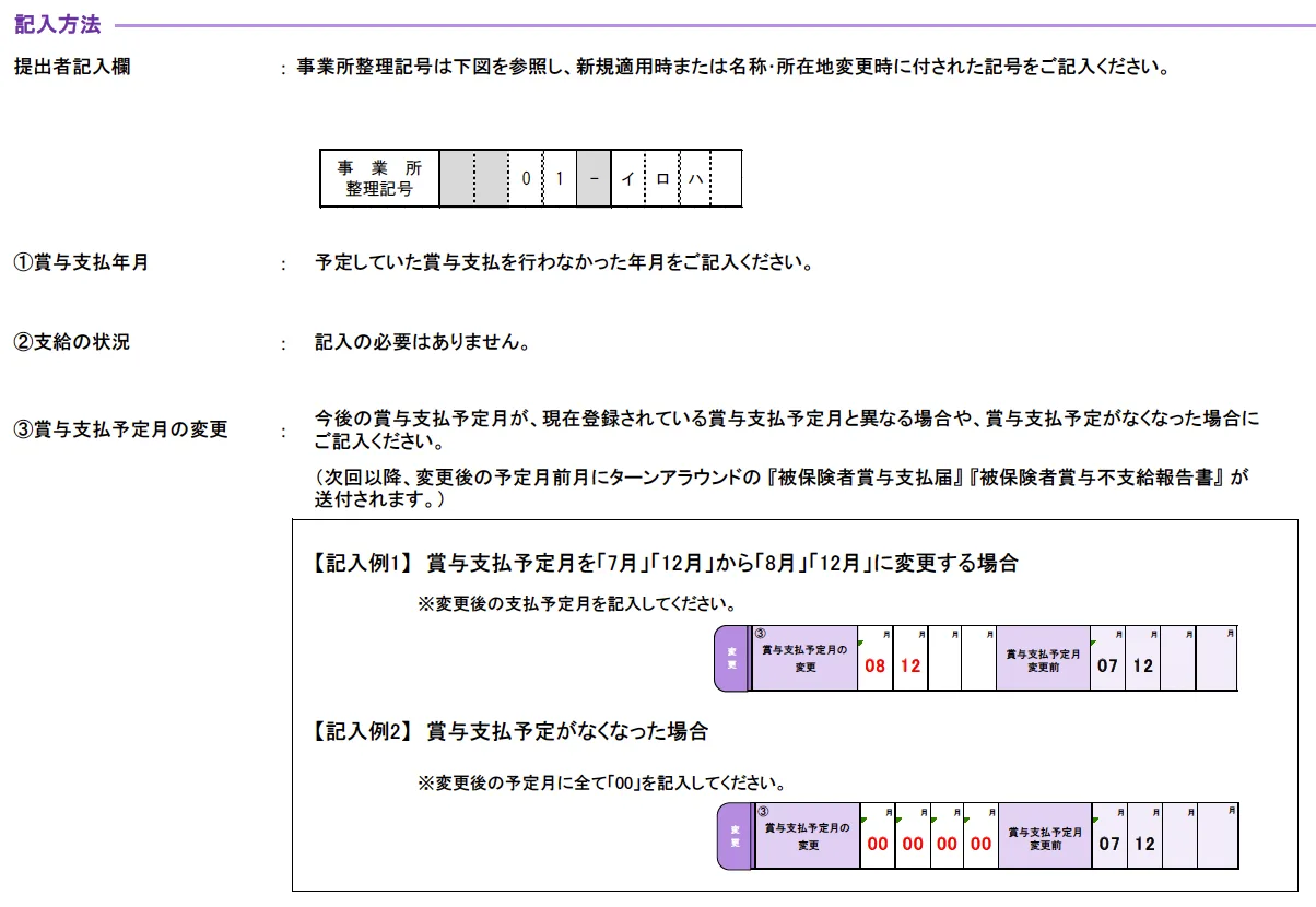 賞与支払月の変更がある場合は、下段の変更欄に新しい賞与支払予定月を記載します。