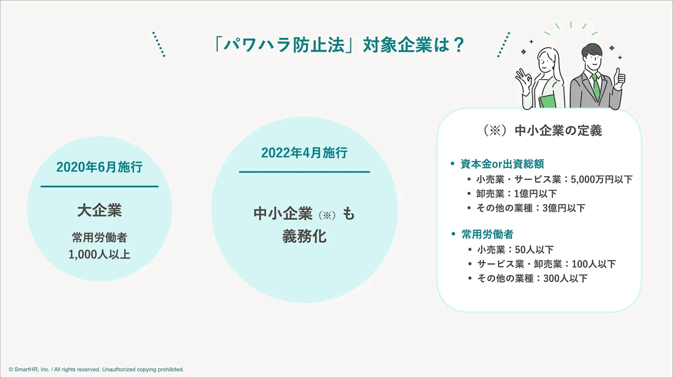こうした流れを受けて整備されたのが、パワハラ防止法です。現在では、企業規模を問わず、すべての事業者が同法の適用対象となっています。