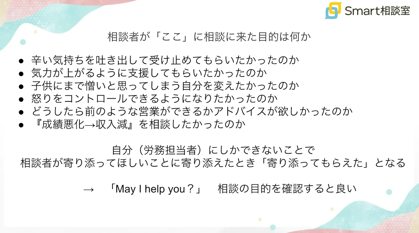 最後のまとめです。ロウムさんは「いろいろなことを受け止めます」という姿勢で、さまざまな内容を聞き出せました。重要なのは、「相談者さんが相談に来た目的は何だったのかをしっかり押さえておくこと」です。