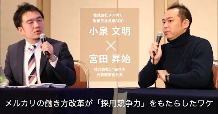 協賛講演として、株式会社SmartHRの代表・宮田昇始がモデレーターとなり、「成長企業は『事業拡大』と『働き方改革』をいかに両立させているのか?」をテーマに、フリマアプリ「メルカリ」を運営する株式会社メルカリの取締役社長兼COO 小泉文明氏にインタビューしました。