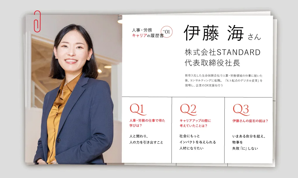 STANDARDは、デジタルトランスフォーメーション(DX:デジタル技術を活用して、企業の業務プロセスやビジネスモデルを革新し、新たな価値を創造すること)支援の分野で豊富な実績を誇ります。伊藤さんは現在、同社の社長を務めていますが、そのキャリアは人事・労務に関する業務から始まったそうですね。