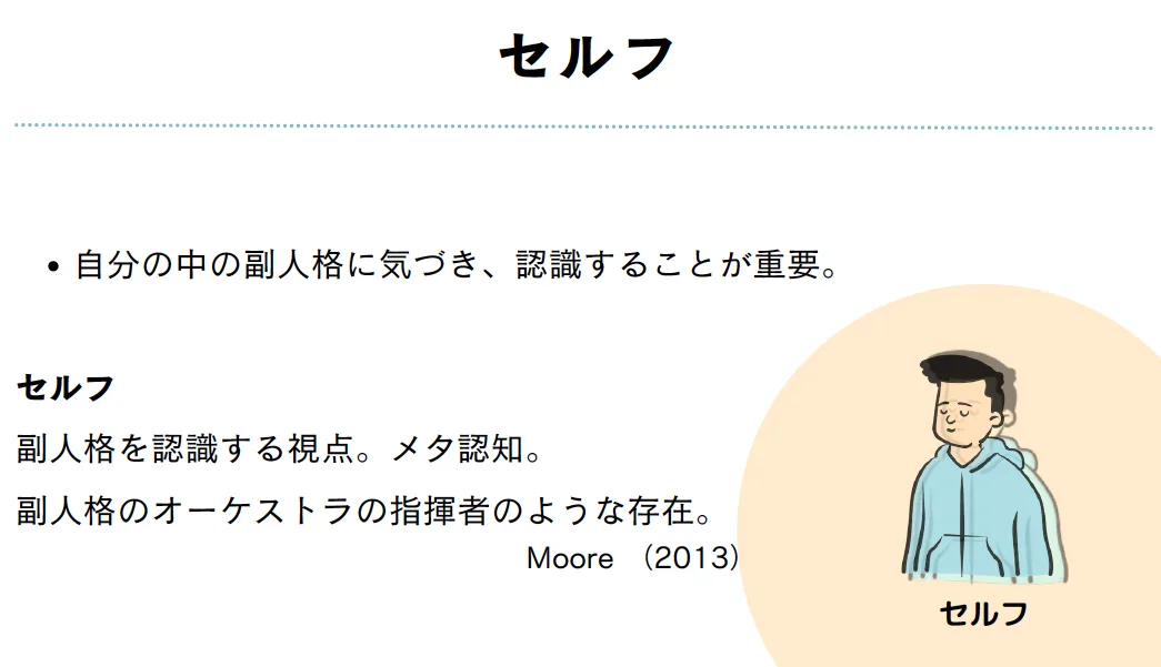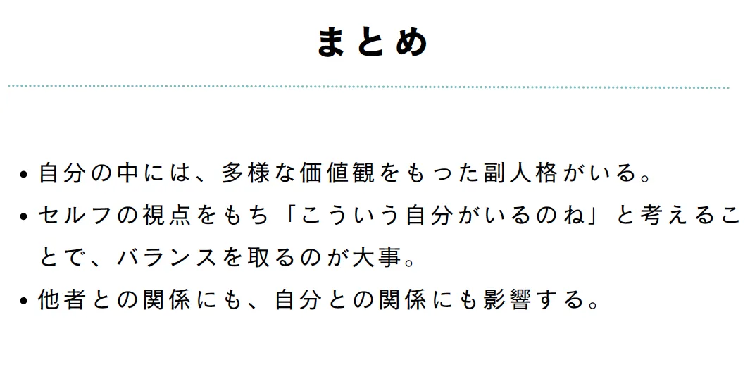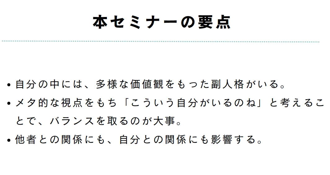 本日の要点は「自分のなかには多様な価値観をもった副人格がいること」「メタ的な視点をもって“こういう自分がいる”と気づいてバランスを取ること」「その副人格は自分の内部、他者との関係に影響していく」の3点です。