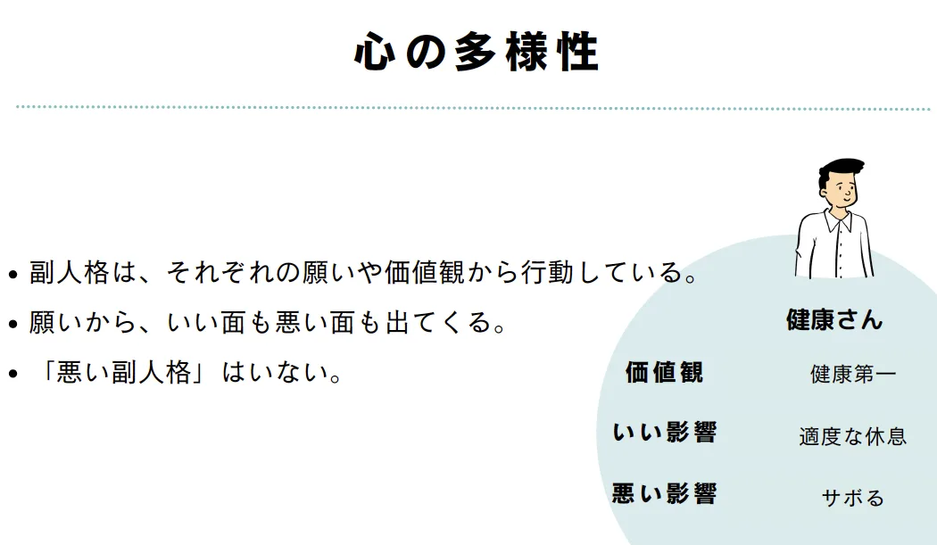 その性格にはよい面も悪い面もあります。たとえば、常に健康一番という価値観の「健康さん」という副人格がいるとします。彼には「適度な休憩を上手にとってくれる」という利点があります。逆に、「忙しいときにもさぼってしまう」という悪い側面もあるのが健康さんです。