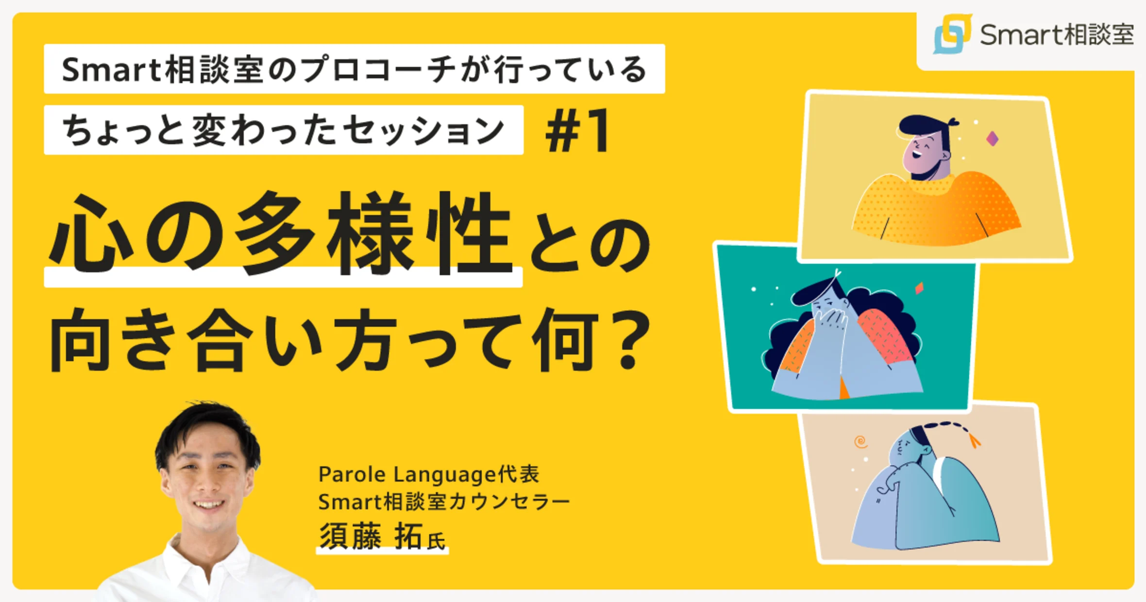 2022年12月20日、オンラインカウンセリングサービス「Smart相談室」を提供する、株式会社Smart相談室主催のオンラインセミナー「Smart相談室のプロコーチが行っているちょっと変わったセッション#1 心の多様性との向き合い方って何?」が開催されました。この記事では、Smart相談室カウンセラーの須藤 拓 氏をお迎えして、心の多様性をテーマにお話しいただいたセミナーの様子をお届けします。